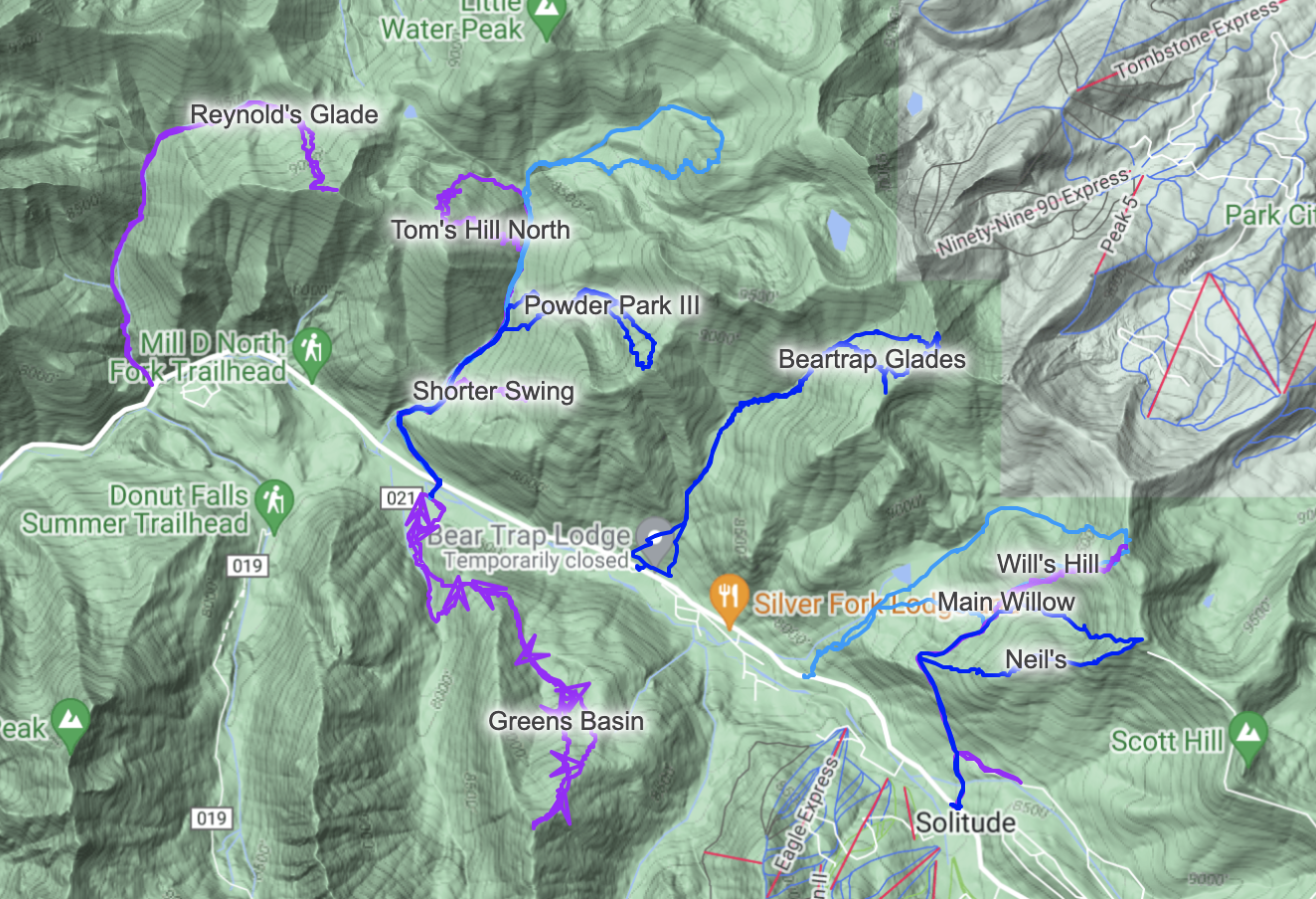 | 3/15 | Beartrap Glades | 5.8 | 2,400 | After a warm day, our late-day turns were a little crusty but we had a blast exploring | Beartrap area has several gladed aspects to ski and great views of the area, including 9990 Chairlift from Canyons Resort (Park City) |